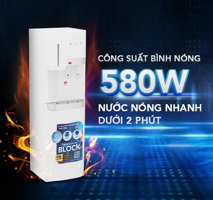 - Công suất bình nóng 580W giúp làm nóng nhanh dưới 2 phút. Sau mỗi lần lấy nước, lớp bảo ôn giữ nhiệt lâu trên 2,5 giờ mới cần đun lại.