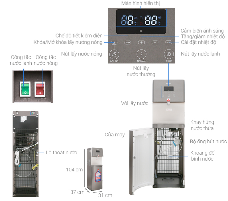 Màn hình led báo nhiệt độ nước trong bình, tiện lợi khi cần sử dụng. Công suất làm nóng 550 W cung cấp nước nóng 4 lít/giờ và công suất làm lạnh 100 W cung cấp nước lạnh 2 lít/giờ thoải mái cho sử dụng gia đình, văn phòng ít người...