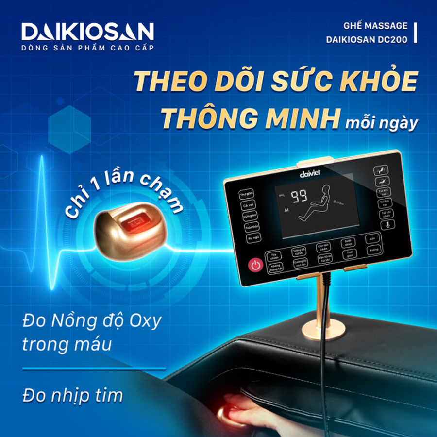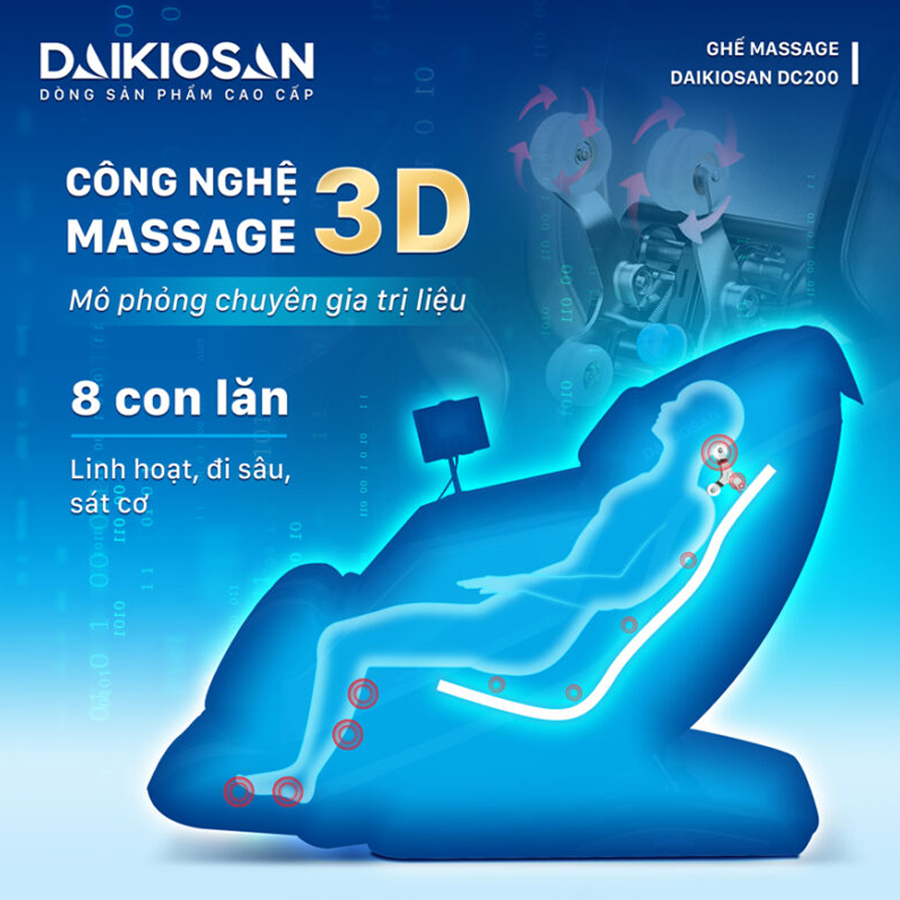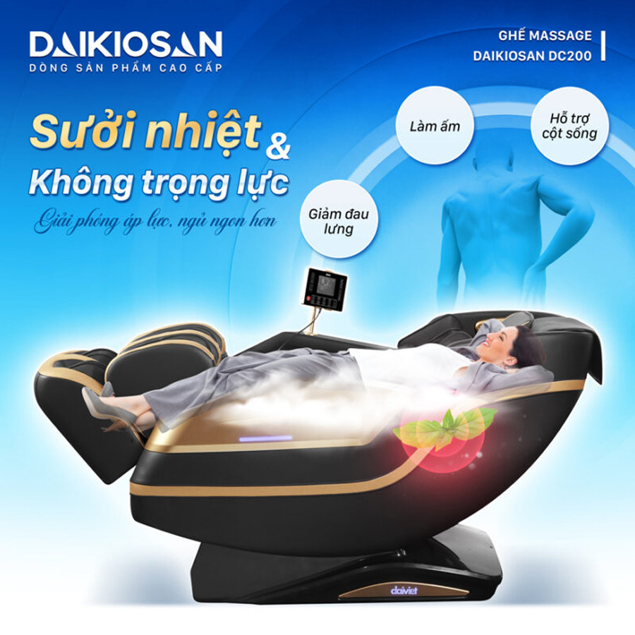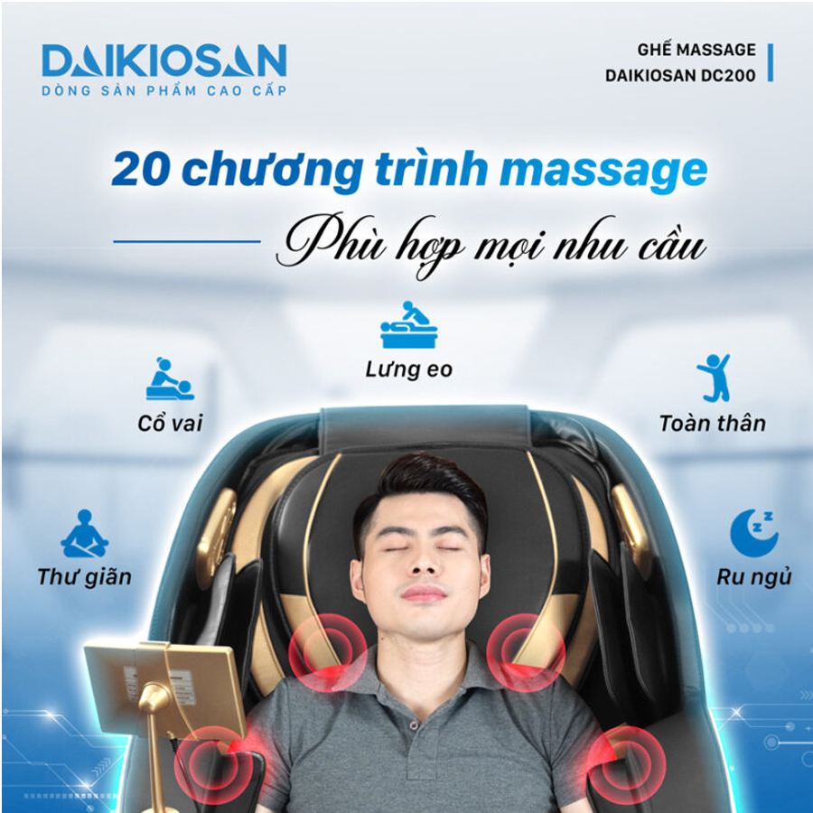 - Ghế massage Daikiosan DC200 xứng đáng với danh xưng “Vua massage dòng 3D” giúp cải thiện sức khỏe. Sản phẩm áp dụng những ưu điểm cao nhất của công nghệ massage 3D hiện đại bằng con lăn, túi khí, sưởi ấm nhiệt…
