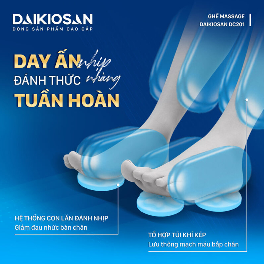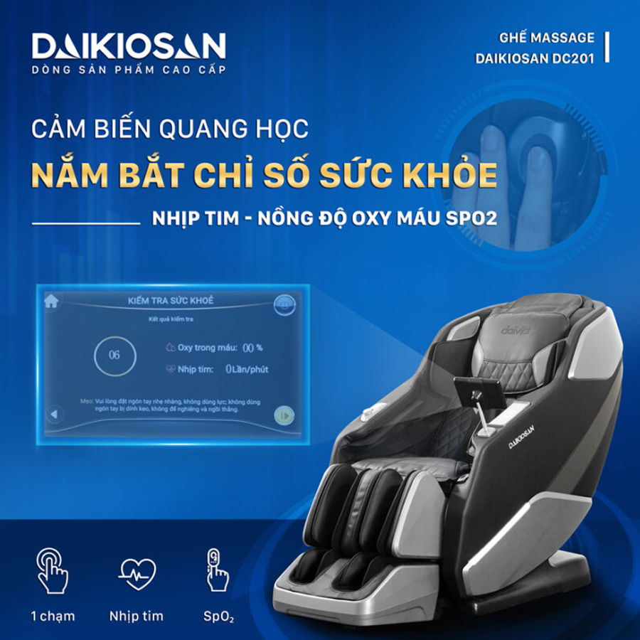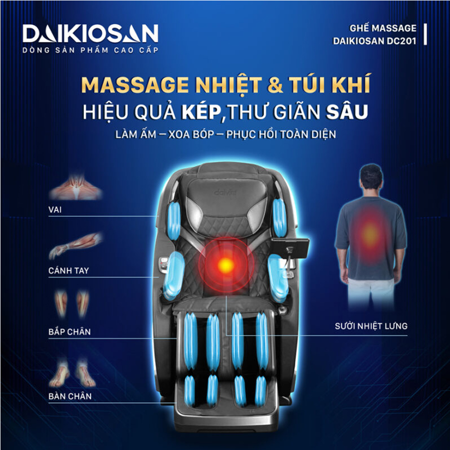 - Ghế massage Daikiosan DC201 là sản phẩm sở hữu công nghệ massage cao cấp nhưng với mức giá vô cùng bình dân. Sản phẩm áp dụng công nghệ thông minh AI, phương pháp trị liệu Đông Y và công nghệ massage 3D giúp xua tan mệt mỏi, giảm đau nhức, thư giãn hiệu quả.