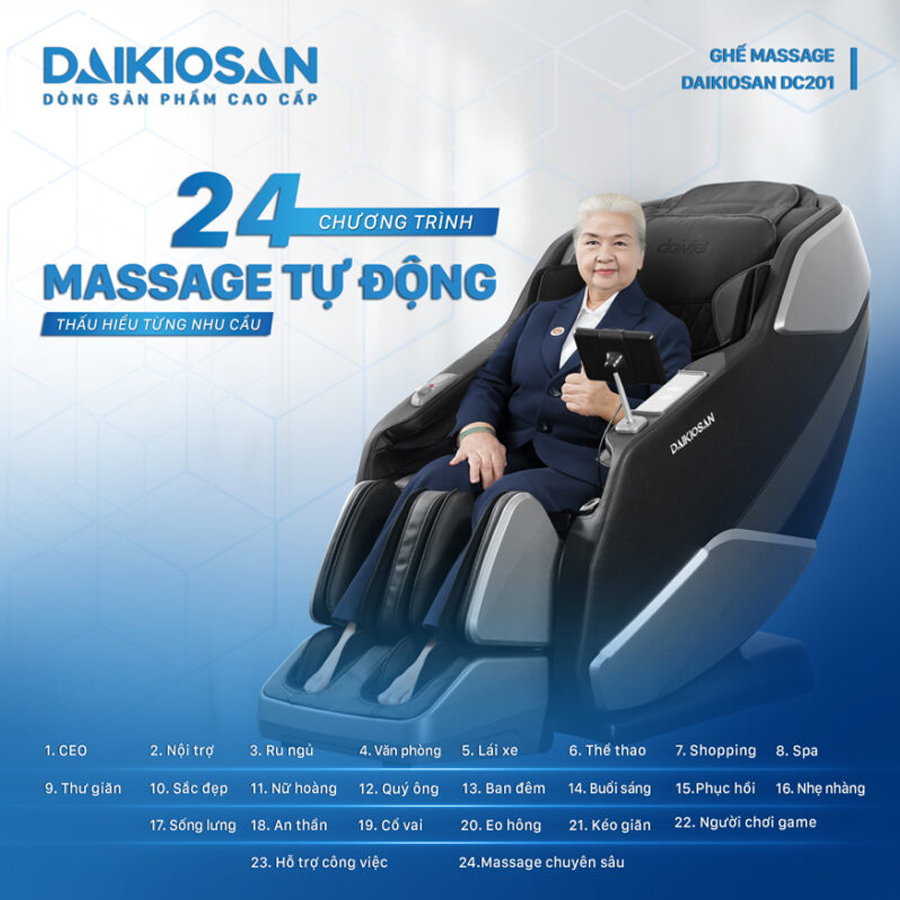 - Ghế massage Daikiosan DC201 có 6 chương trình massage tự động phù hợp với mọi đối tượng và thời điểm theo nhu cầu, sở thích của mỗi người. Bạn có thể chọn các chương trình massage để trải nghiệm các liệu pháp massage hiện đại như được các chuyên viên massage tại các Spa cao cấp 5*.