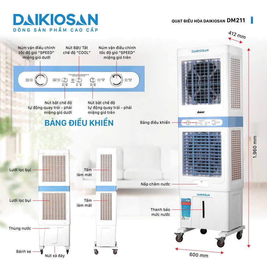- Máy làm mát Daikiosan DM211 thuộc dòng máy làm mát đứng hiệu suất cao.