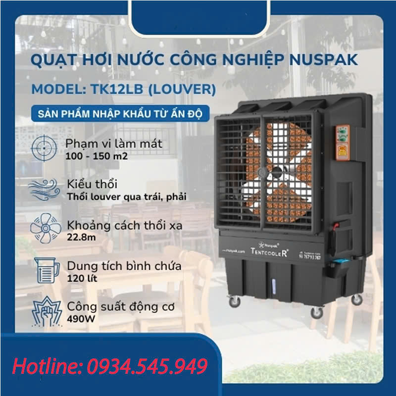 - Quạt hơi nước công nghiệp Nuspak TK12LB là một loại quạt hơi nước công nghiệp được thiết kế để làm mát hiệu quả cho các không gian rộng lớn. Sản phẩm này thường được sử dụng trong các nhà xưởng, nhà kho, sự kiện ngoài trời, nhà hàng, quán ăn và các khu vực công nghiệp khác.