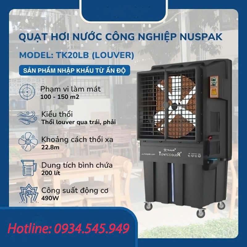 - Bạn đang tìm kiếm một giải pháp làm mát mạnh mẽ, bền bỉ và hiệu quả cho không gian rộng lớn? NUSPAK TK20LB chính là câu trả lời hoàn hảo. Với dung tích bình nước lên đến 200 lít, máy làm mát công nghiệp NUSPAK TK20LB cung cấp lượng hơi nước lớn, làm mát nhanh chóng và hiệu quả diện tích lên đến 100 – 150 m². Thiết kế louver thông minh giúp phân phối không khí đều khắp, đảm bảo mọi góc đều được làm mát.