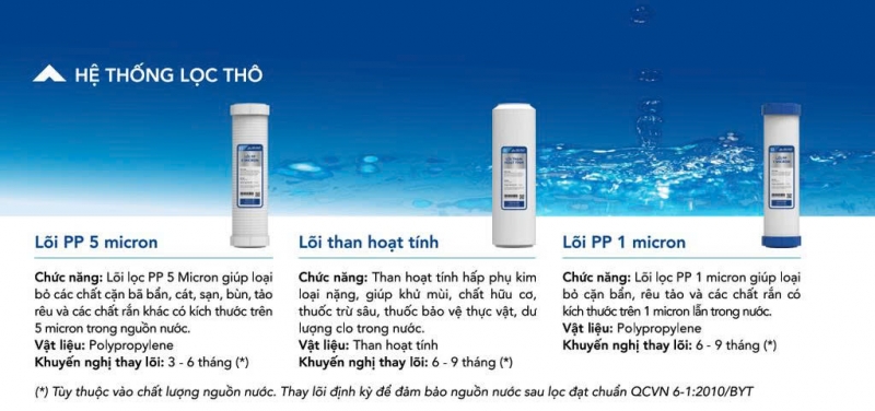 Hệ thống lọc thô: 3 lõi lọc thô (PP 5 micron, Than hoạt tính, PP 1 micron)
