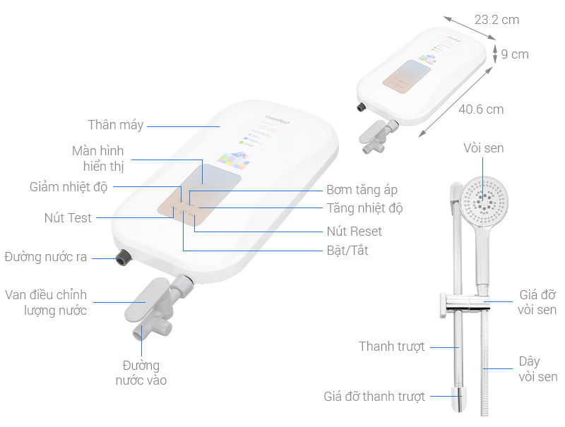 - Máy tắm nước nóng Comfee hoạt động ổn định trong dãy điện áp từ 176V đến 264V.
