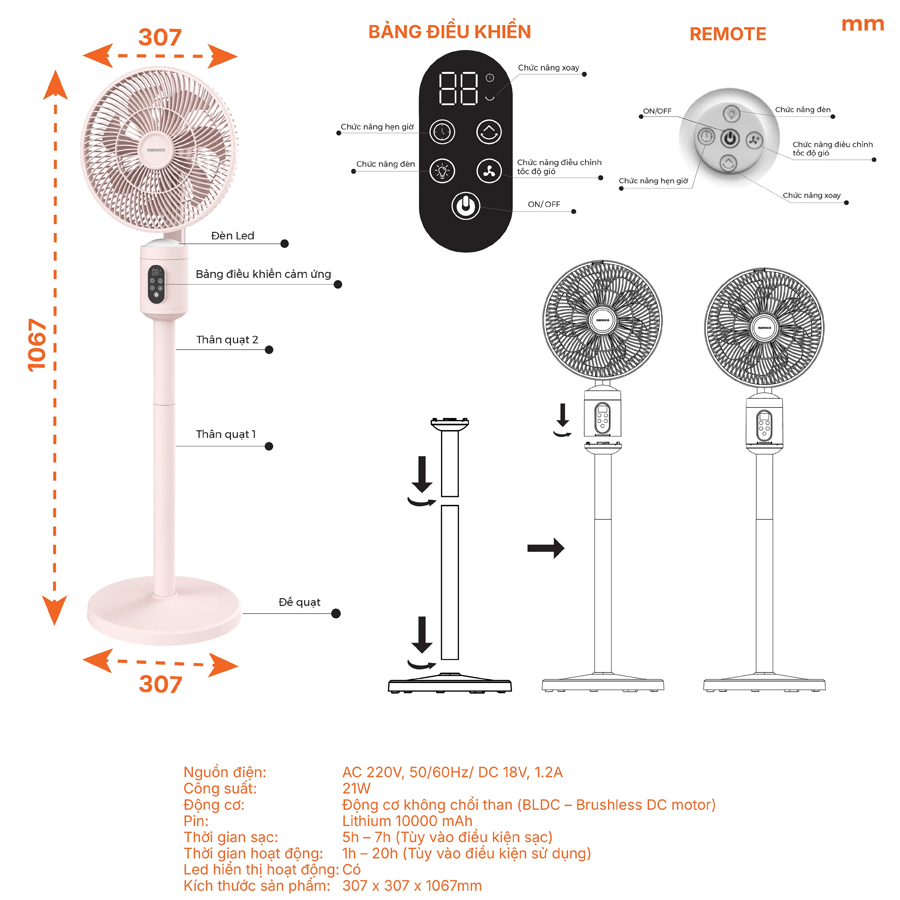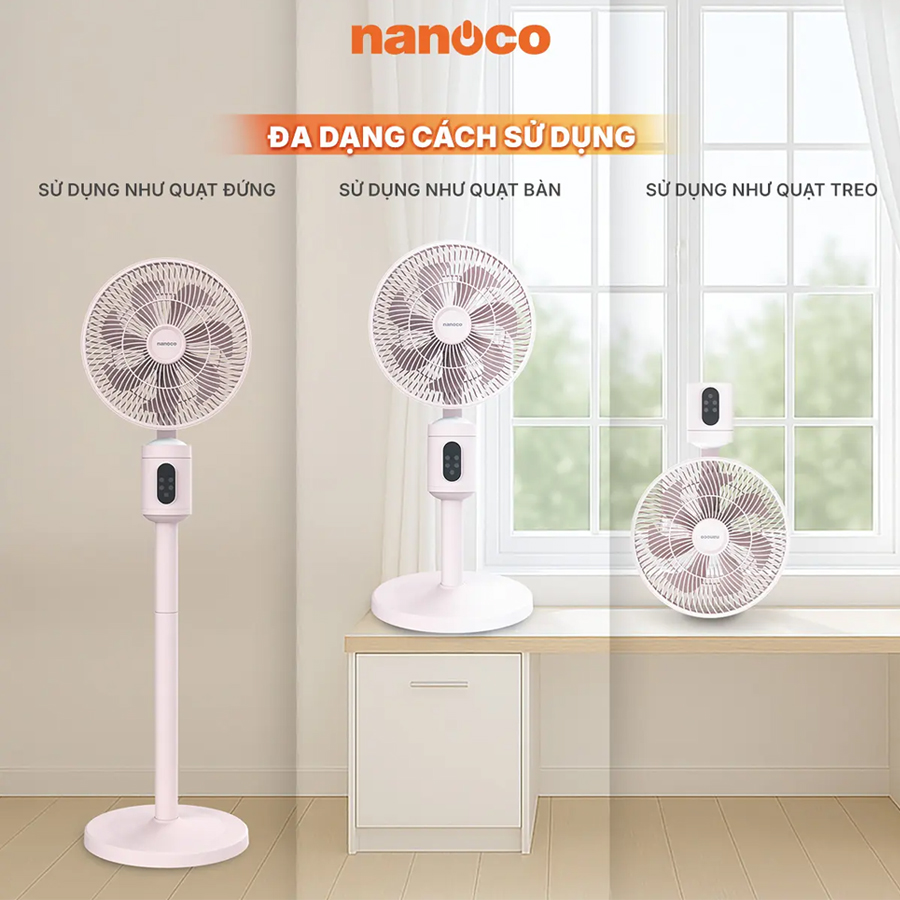 - Thiết kế đa năng: Dùng như quạt bàn, quạt đứng, quạt treo, phù hợp nhiều không gian.